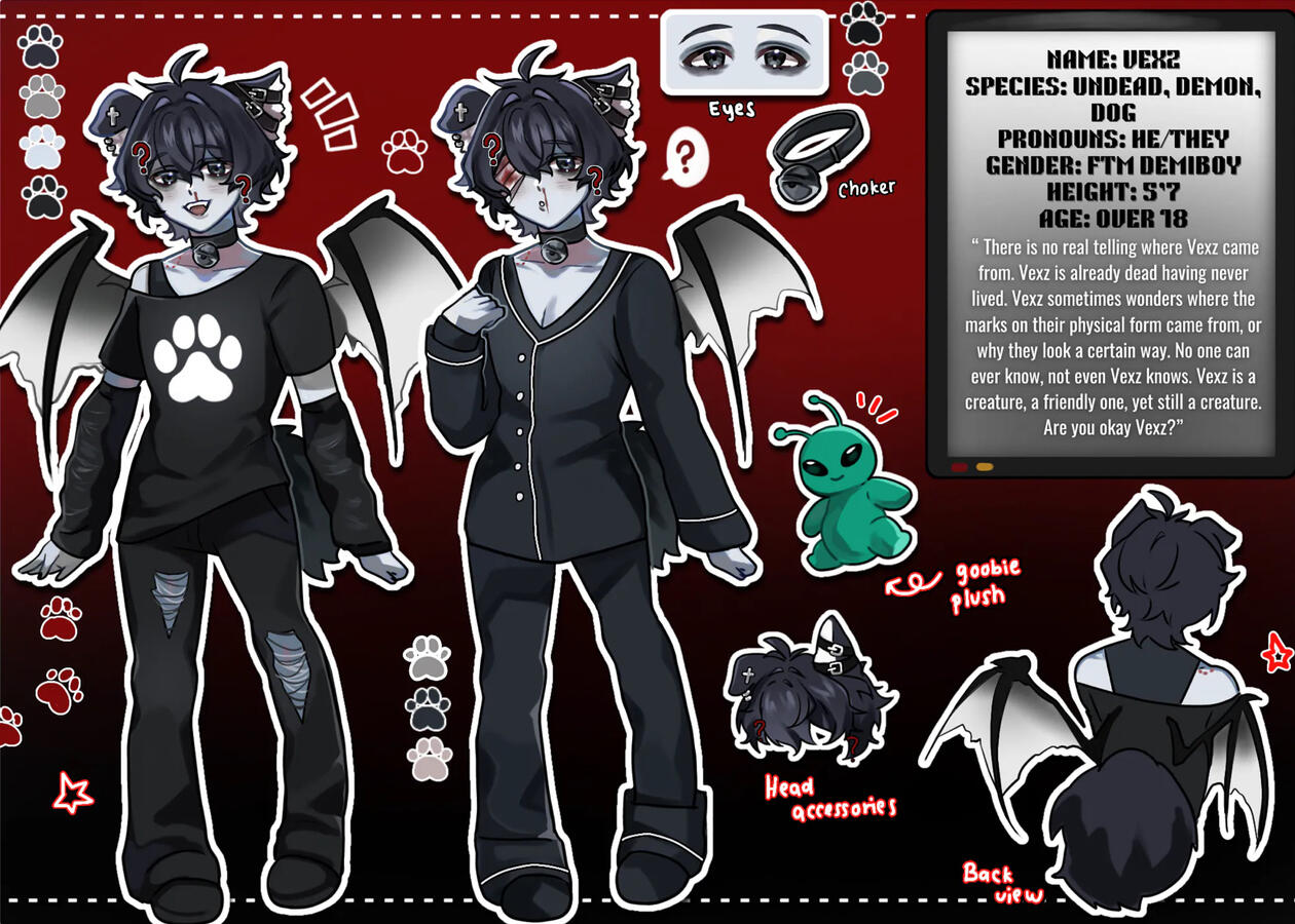 There is no real telling where Vexz came from. Vexz is already dead having never lived. Vexz sometimes wonders where the marks on their physical form came from, or why they look a certain way. No one can ever know, not even Vexz knows. Vexz is a creature, a friendly one, yet still a creature. Are you okay Vexz?
